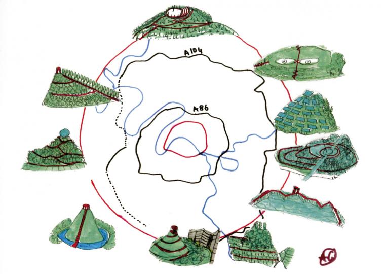 On se souvient du projet de l’équipe d’Antoine Grumbach pour la consultation internationale du Grand Paris qui, en 2008, a poussé la réflexion urbaine et paysagère jusqu’au Havre. Onze ans après, l’architecte-urbaniste resserre le propos autour de la couronne parisienne en prenant l’angle du “Land Art Métropolitain”. Poursuivant son but de fabriquer un système de représentation de la métropole et en s’appuyant sur la célèbre formule de Michel Corajoud “un paysage, c’est la rencontre du ciel et de la terre”, il a imaginé de développer une série de points hauts.