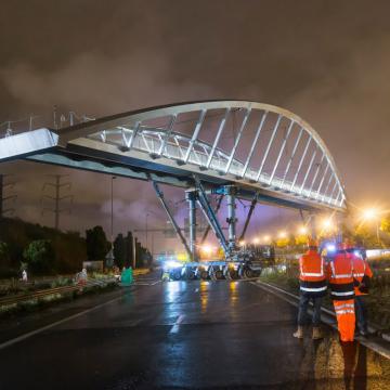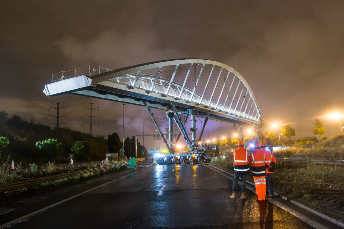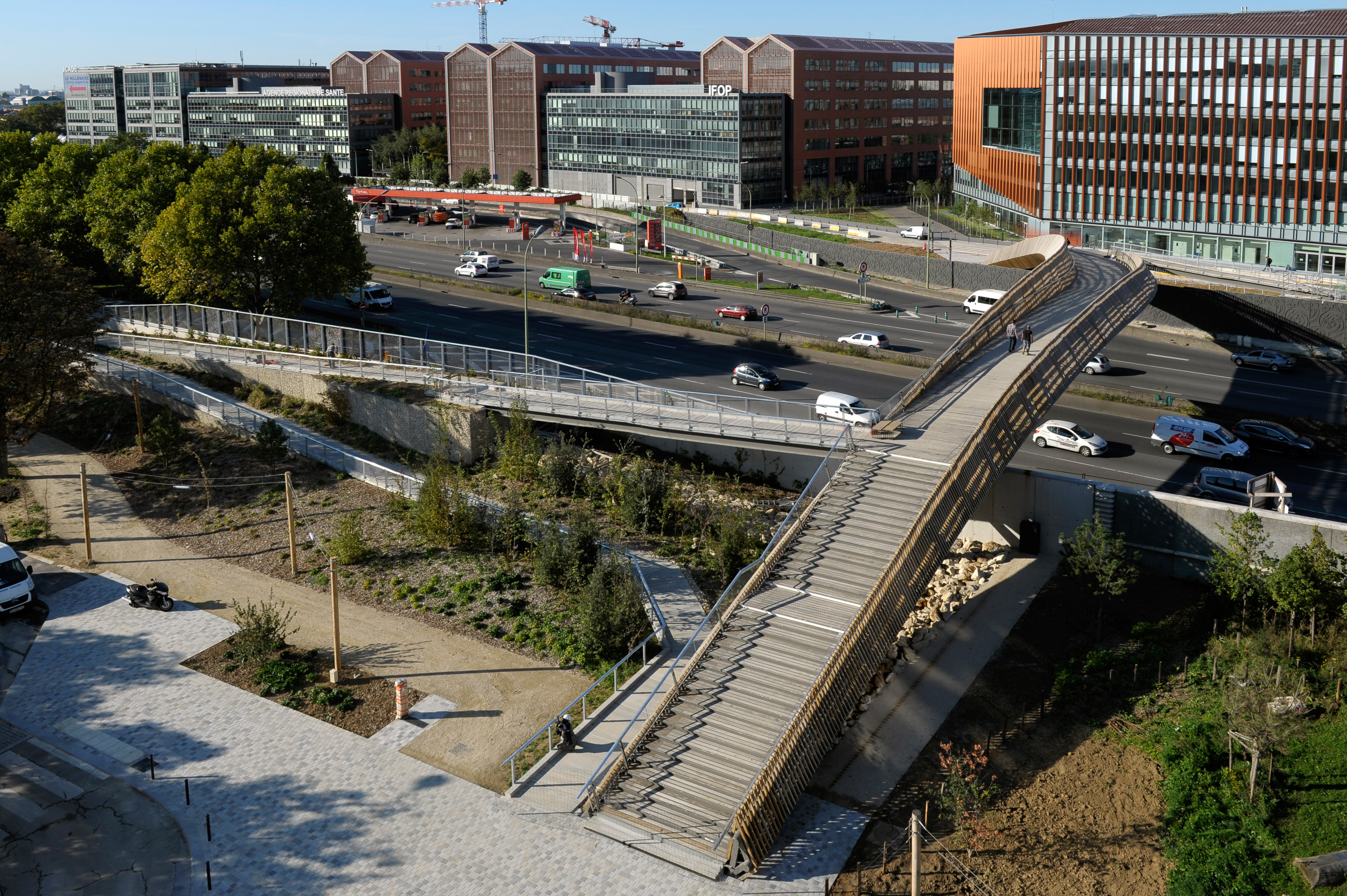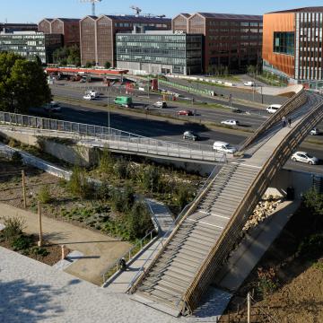 - La première passe au-dessus du périphérique parisien. Elle relie le nouveau quartier Paris Nord-Est (Entrepôt Macdonald et ZAC Claude Bernard, Paris 19e) et le quartier du Millénaire développé par Icade à Aubervilliers. Posée le 15 mai, elle est en service depuis le 2 octobre. Elle a été conçue par l’agence DVVD (Ingénieurs, Architectes, Designers) pour la Semavip, maître d’ouvrage. Longue de 92 m hors rampes, elle comporte de chaque côté des escaliers, doublés d’une rampe zigzaguant en pente douce, accessible à tout ce qui roule. Cette opération d’un montant de 8,3 millions € HT a bénéficié du soutien financier de la Ville de Paris, de la Région Île-de-France et d’Icade