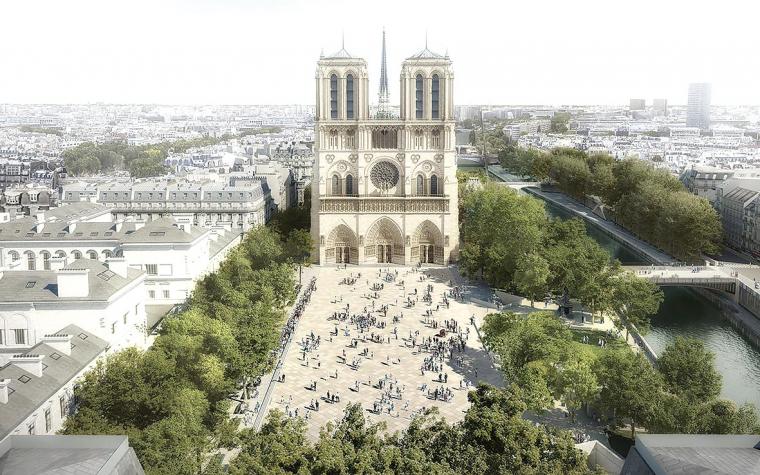 4,75 hectares en plein cœur de la capitale, c’est la surface à traiter. Dans le cadre d’un dialogue compétitif, la consultation pour les abords de Notre-Dame s’est déroulée pendant 10 mois. Des quatre équipes en lice, le jury présidé par Anne Hidalgo, la maire de Paris, a retenu le projet de l’équipe menée par le paysagiste Bas Smets1.