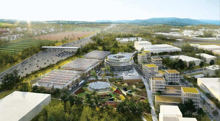 Adieu les boîtes en périphérie, ne m’appelez plus zone d’activités… À la sortie de Mantes-la-Jolie vers la Normandie, le long de l’autoroute A13, va se développer un nouveau type de quartier d’activités sur plus de 50 hectares, Mantes Innovaparc, selon un plan urbain en macro-lots de l’architecte-urbaniste Christian Devillers. En liaison directe avec Paris, ce lieu plus connu pour son péage est en pleine reconquête. Au terme d’un appel à idées lancé par l’EPAMSA, le groupe Pichet a été retenu sur un projet développant l’agriculture urbaine sur un des macro-lots : un paysage “comestible et rentable” basé sur l’économie circulaire avec pour objectif de nourrir 25 000 personnes. Dans ce cadre, l’agence Badia Berger, avec Ilimelgo, a conçu un quartier mixte et productif. Rappelons que “la ville productive” est le thème que le concours Europan a choisi pour ses deux dernières sessions. Les architectes ont ainsi proposé une programmation agricole diversifiée (aquaponie, permaculture, AMAP…), couplée à un programme de transformation in situ. Sans oublier la gestion des énergies et des déchets. “Révéler le territoire tout en marquant la dynamique de projet”, c’est l’enjeu de cette rencontre entre la grande échelle d’une infrastructure et une échelle locale.
